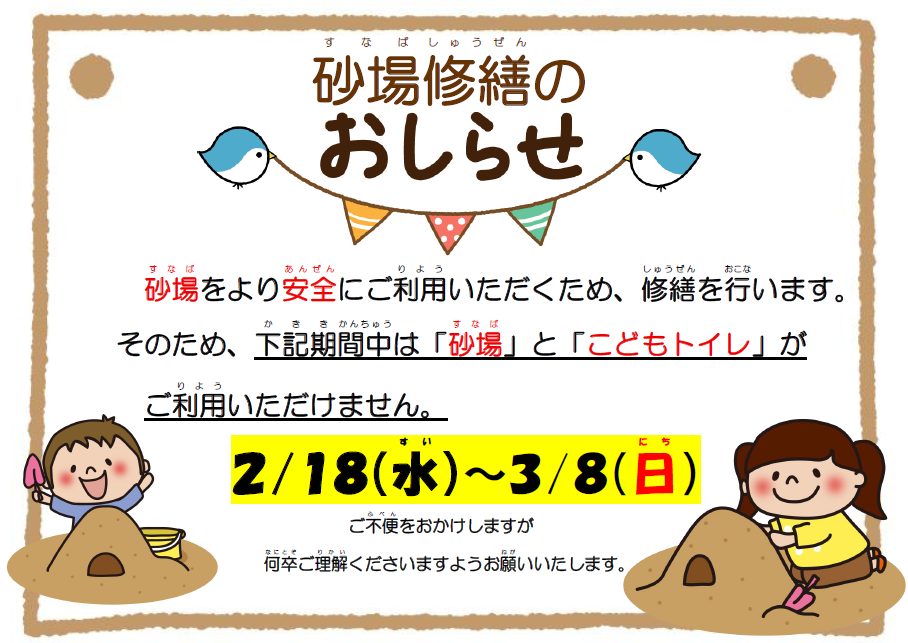 こどもの国では、2月18日(水)から3月7日(土)まで、屋内砂場のリニューアル工事を行います。この期間は、砂場で遊ぶことができず、お子様には残念な思いをさせてしまうことをお許しください。新しい砂場が完成したらホームページやLINE等でお知らせしますので、楽しみに待っていてくださいね。