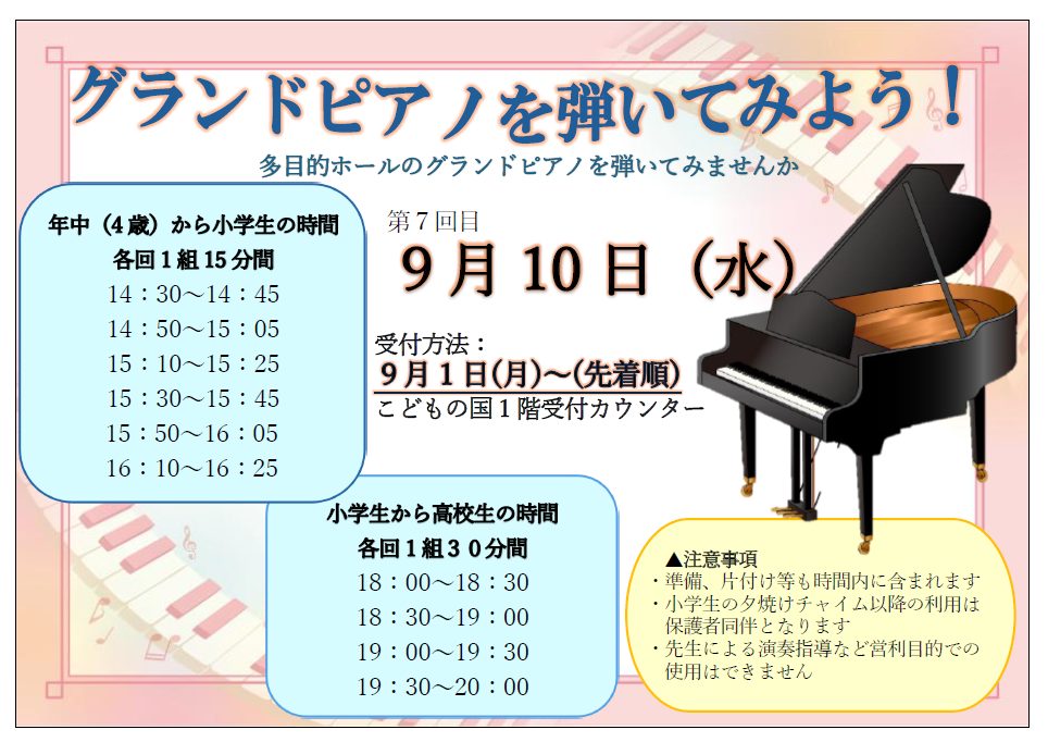 イベント情報 🌈9月10日(水)「グランドピアノ🎹を弾いてみよう❣」🌈 2025/09/08 多目的ホールのグランドピアノ🎹を弾いてみませんか~💗 詳細は画像をご覧ください☺️✨ (事前申込み制となります✍受付までお問い合わせくださいませ☎) « 前の記事 次の記事 » 前ページに戻る