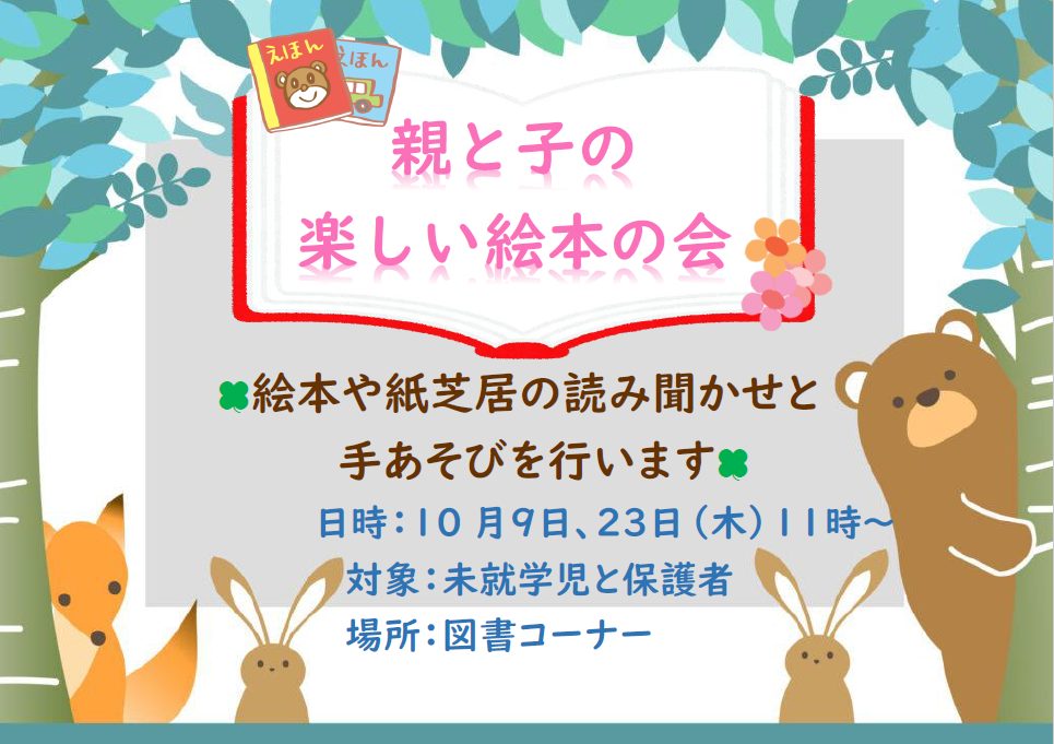 イベント情報 🌈10月9日(木)開催「📖親と子の楽しい絵本の会📖」の講座をご紹介します🌈 2025/10/07 親子で楽しむ読み聴かせの時間です 手あそびタイムもあるよ 図書コーナーでお待ちしております🤗💗 « 前の記事 次の記事 » 前ページに戻る