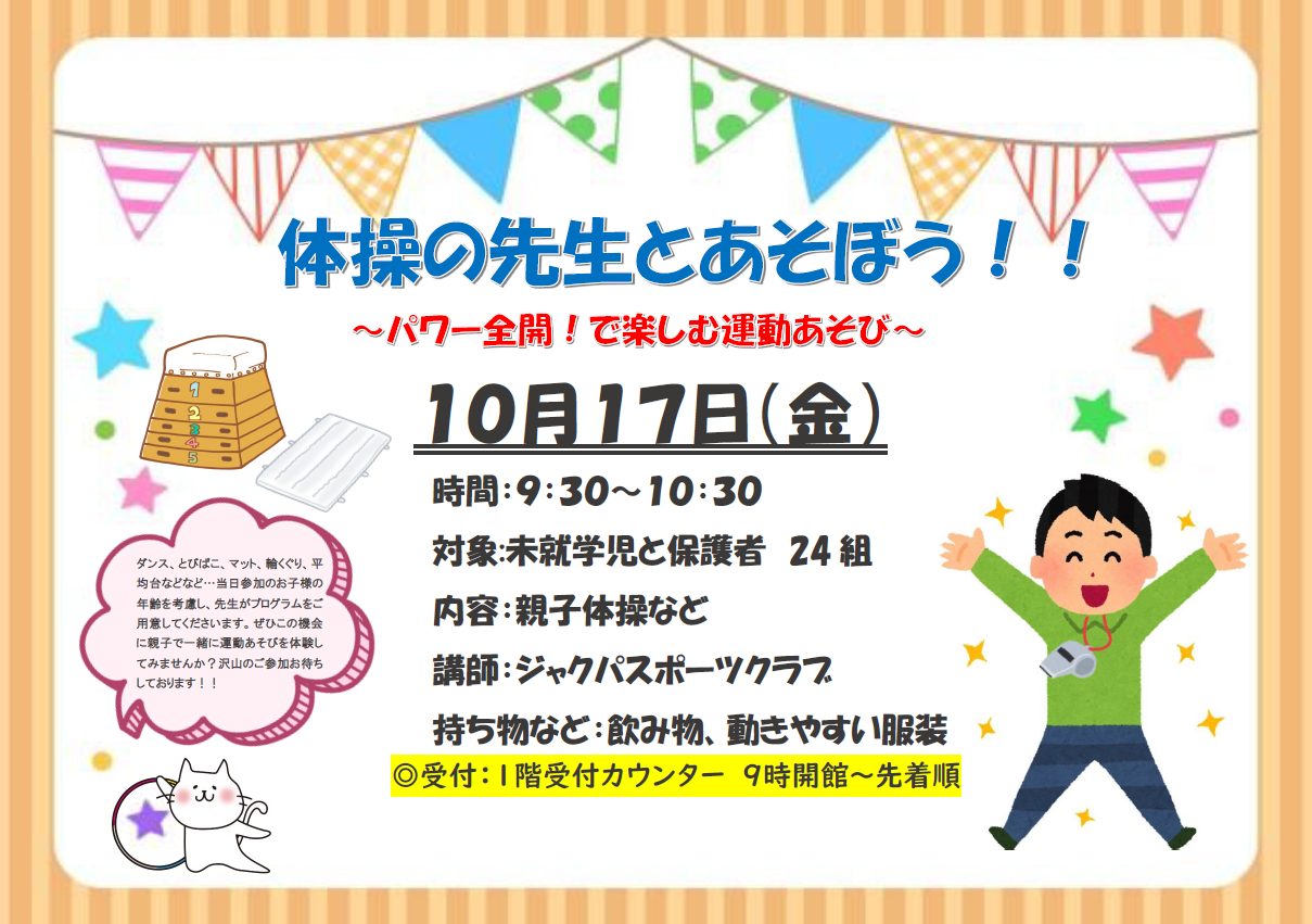 🌈10月17日(金)開催「体操の先生とあそぼう🙆🏻♂️‼」の講座をご紹介します🌈
