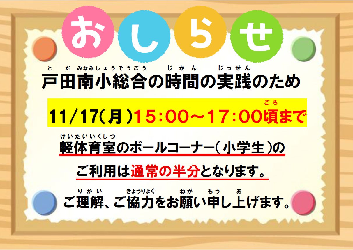 11月17日(月)は「戸田南小総合の時間の実践🏫」開催のため、