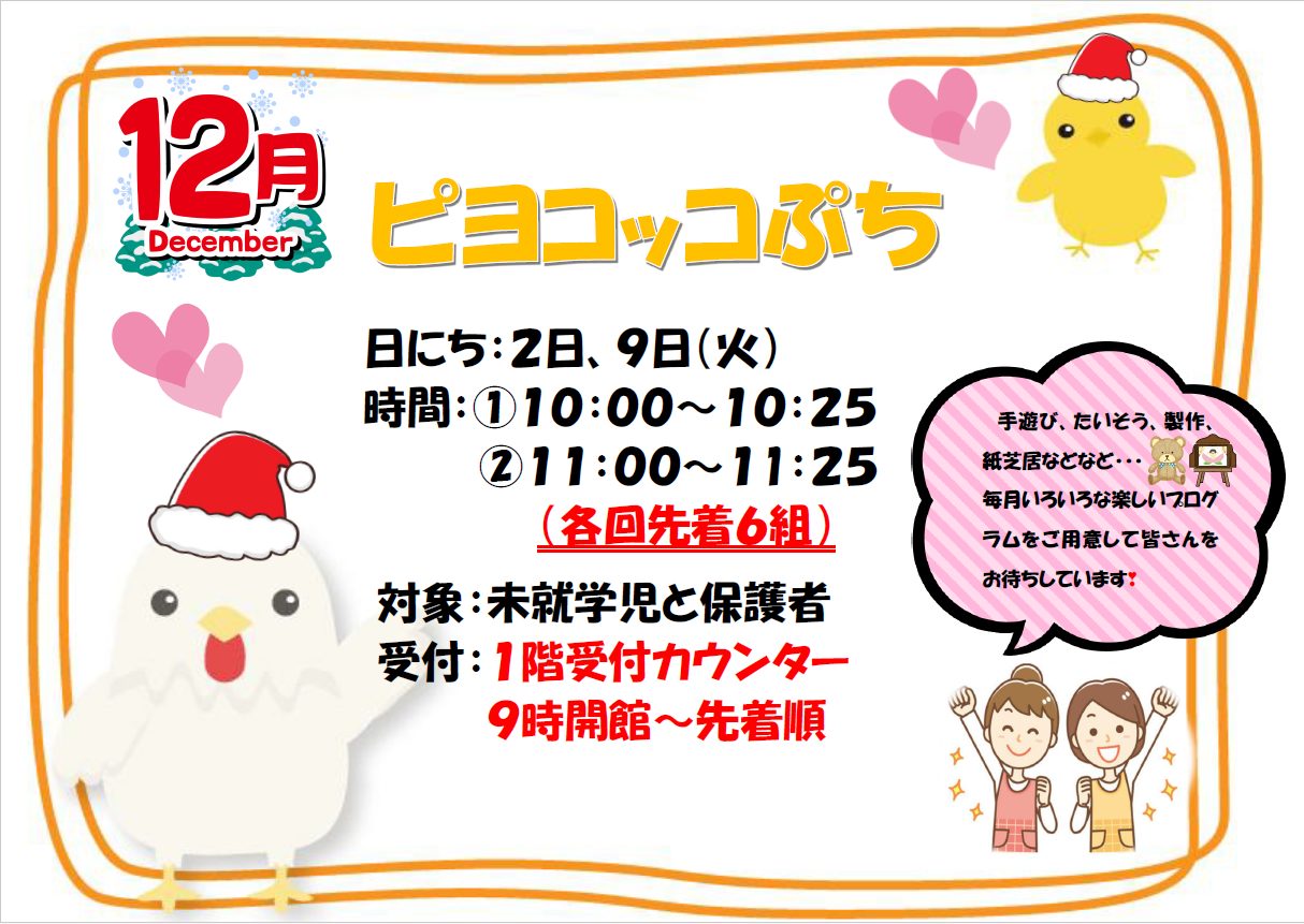 イベント情報 🌈12月2日(火)開催「🐔ピヨコッコぷち🐤」の講座をご紹介します🌈 2025/11/28 「制作・歌・手遊び」など季節ごとのテーマで、 親子いっしょに楽しみましょう👩👧💗 « 前の記事 次の記事 » 前ページに戻る