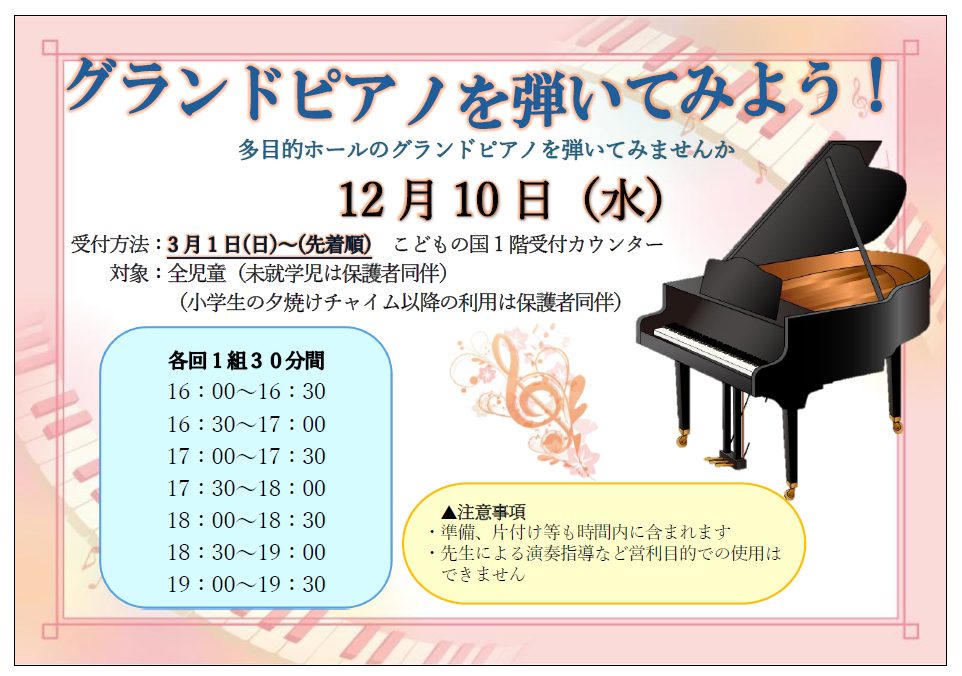 イベント情報 🌈12月10日(水)「グランドピアノ🎹を弾いてみよう❣」🌈 2025/12/06 多目的ホールのグランドピアノ🎹を弾いてみませんか~💗 詳細は画像をご覧ください☺️✨ (事前申込み制となります✍受付までお問い合わせくださいませ☎) « 前の記事 次の記事 » 前ページに戻る