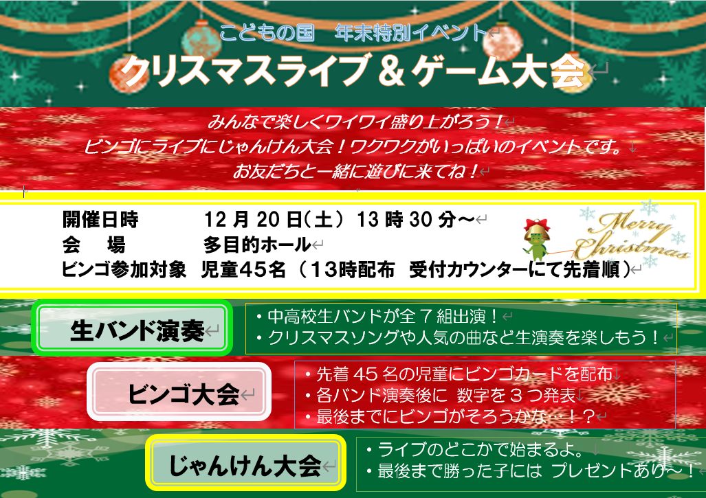 20日(土)は、中高生バンドによる🎹クリスマスライブ🎄🎸を行います🎵