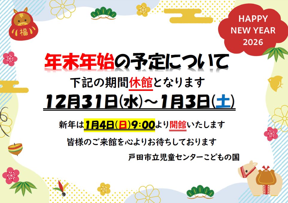 イベント情報 ✨🎍年末年始の予定についてお知らせいたします🎍✨ 2025/12/21 12月31日(水)~1月3日(土)の期間は年末年始休館とさせていただきます。 どうぞよろしくお願いいたします🐍✨🐎 « 前の記事 次の記事 » 前ページに戻る