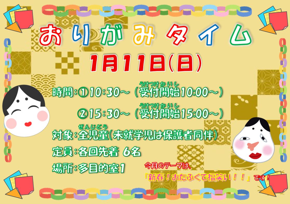 今月11日(日)開催のおりがみタイムのお知らせです😊