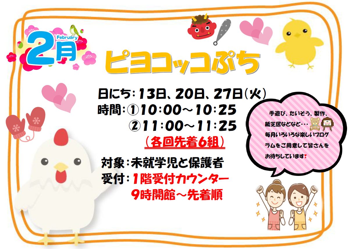 イベント情報 🌈1月27日(火)開催「🐔ピヨコッコぷち🐤」の講座をご紹介します🌈 2026/01/25 「制作・歌・手遊び」など季節ごとのテーマで、 親子いっしょに楽しみましょう👩👧💗 « 前の記事 次の記事 » 前ページに戻る