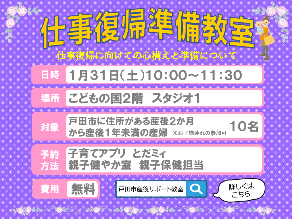 🌈1月31日(土)開催「🤱🏻産婦向け仕事復帰準備教室✍」の講座をご紹介します🌈