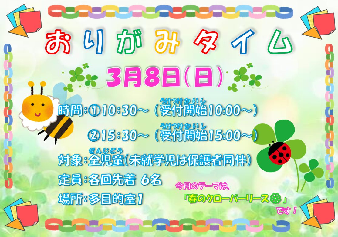 3月8日開催のおりがみタイムのお知らせです🎉🌈
