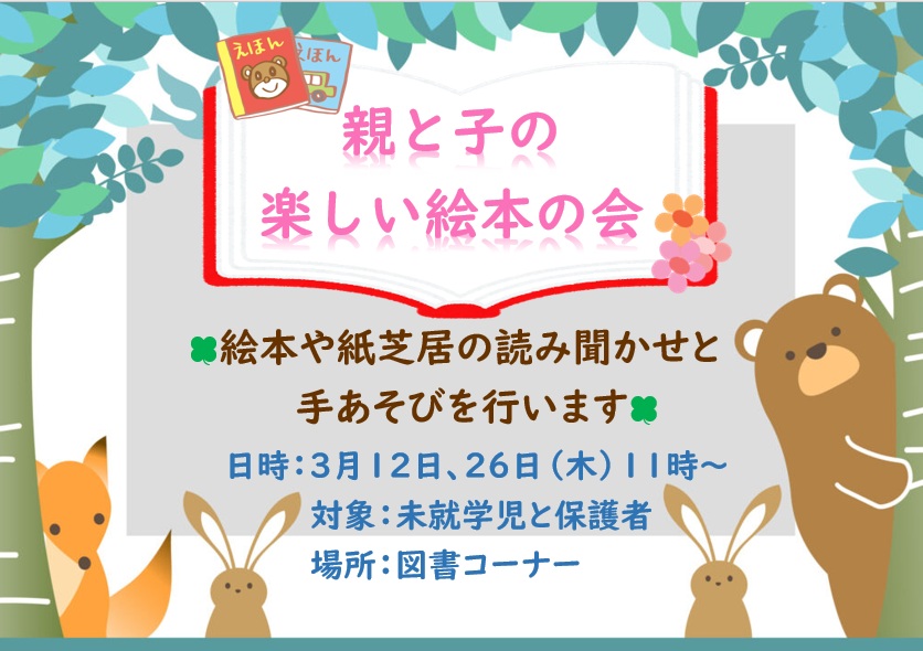イベント情報 🌈3月12日(木)開催「📖親と子の楽しい絵本の会📖」の講座をご紹介します🌈 2026/03/11 親子で楽しむ読み聴かせの時間です 手あそびタイムもあるよ 図書コーナーでお待ちしております « 前の記事 次の記事 » 前ページに戻る