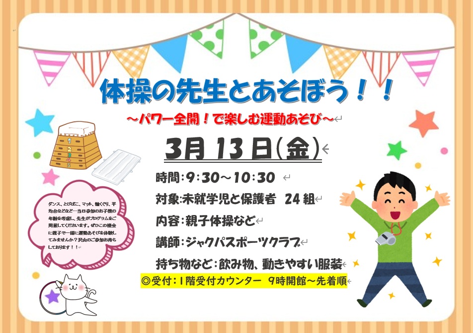 🌈3月13日(金)開催「体操の先生とあそぼう🙆🏻♂️‼」の講座をご紹介します🌈