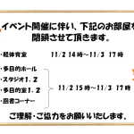 11月2日(日)~3日(月・祝)はイベント開催準備等のため、 画像のとおりとさせていただきます。 ご不便をお掛けいたしますが、宜しく…
